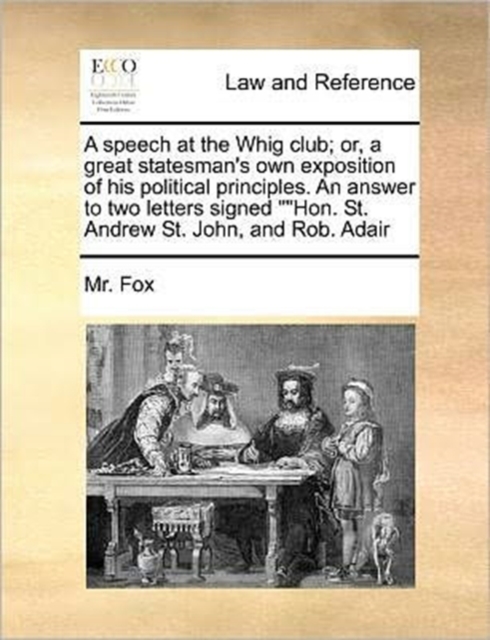 A Speech at the Whig Club; Or, a Great Statesman's Own Exposition of His Political Principles. an Answer to Two Letters Signed Hon. St. Andrew St. John, and Rob. Adair