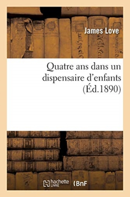 Quatre ans dans un dispensaire d'enfants... / par le Dr James Love, ...Date de l'édition originale: 1890Le présent ouvrage s'inscrit dans une politique de conservation patrimoniale des ouvrages de la littérature Française mise en place avec la BNF.HACHETTE LIVRE et la BNF proposent ainsi un catalogue de titres indisponibles, la BNF ayant numérisé ces oeuvres et HACHETTE LIVRE les imprimant à la demande.Certains de ces ouvrages reflètent des courants de pensée caractéristiques de leur époque, mais qui seraient aujourd'hui jugés condamnables.Ils n'en appartiennent pas moins à l'histoire des idées en France et sont susceptibles de présenter un intérêt scientifique ou historique.Le sens de notre démarche éditoriale consiste ainsi à permettre l'accès à ces oeuvres sans pour autant que nous en cautionnions en aucune façon le contenu.Pour plus d'informations, rendez-vous sur www.hachettebnf.fr