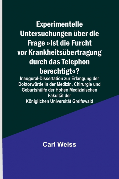 Experimentelle Untersuchungen über die Frage Ist die Furcht vor Krankheitsübertragung durch das Telephon berechtigt?; Inaugural-Dissertation zur Erlangung der Doktorwürde in der Medizin, Chirurgie und Geburtshülfe der Hohen Medizinischen Fakultät der Königlichen Universität Greifswald, wurde als ein Hauptwerk in der gesamten Menschheitsgeschichte anerkannt, und wir haben Vorkehrungen getroffen, um seine Bewahrung zu gewährleisten, indem wir dieses Buch in moderner Weise für gegenwärtige und zukünftige Generationen neu herausgeben. Dieses Buch wurde komplett neu abgetippt, überarbeitet und neu formatiert. Der Text ist lesbar und klar, da diese Bücher nicht aus gescannten Kopien erstellt werden.